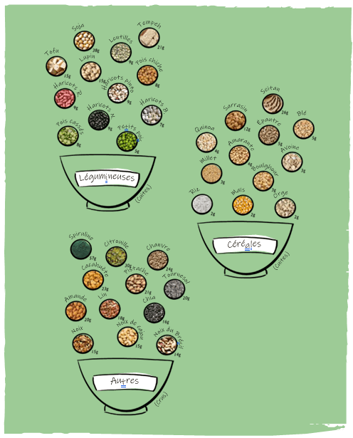 Si vous n’êtes pas familier.e.s de la cuisine végétarienne, il existe beaucoup d’alternatives aux repas carnés : les légumineuses (lentilles, pois chiches, haricots, fèves, pois, etc) ont des apports assez proches de ceux de la viande, pas d’inquiétude à avoir donc sur le manque d’apport en protéines. Niveau goût et simplicité des plats, vous pouvez tout simplement suppri- mer la viande de certains plats sans avoir besoin de la substituer, ça sera d’ailleurs souvent meilleur (au lieu de vous embêter à faire des pâtes bolo avec des protéines de soja, faites simplement des pâtes sauce tomate, ça sera très bon et bien plus simple!)