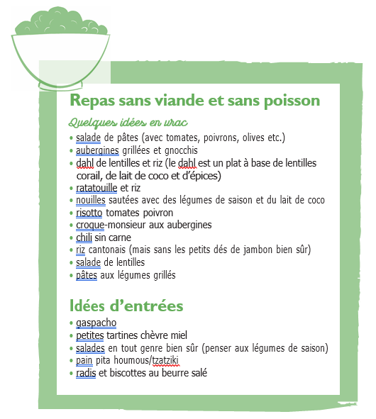Lors de la préparation des menus du camp, on vous conseille de surligner en rouge (ou autre couleur) les repas qui contiennent de la viande ou du poisson, cela permettra de vous rendre compte de la fréquence de votre consommation (à la fois le pâté en entrée, les lardons ou les steaks, et même le thon de votre salade de riz en J5) !