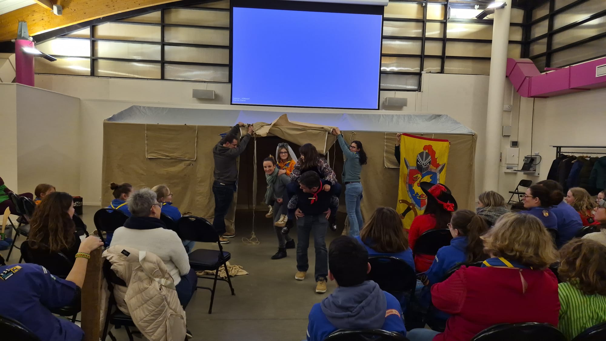 Par exemple l’an dernier, le choix d’un décor de camp scout avait été choisi avec au programme le montage du marabout dans la salle des fêtes, puis des équipes adultes et enfants mélangés qui s’affrontent sur le fameux concu, l’apprentissage des noeuds et du montage de trépied, le choix d’un imaginaire et une présentation à faire devant tout le monde! Les jeunes ont parfaitement guidé leurs parents dans l’aventure!