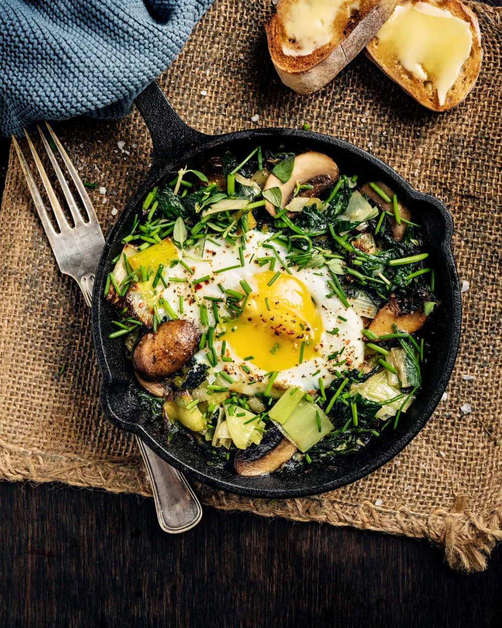 Dans une poêle , plat à paëlla ou dans une gamelle, versez l’huile d’olive, l’échalote, les champignons, les poireaux égouttés et les feuilles d’épinards. laissez cuire.