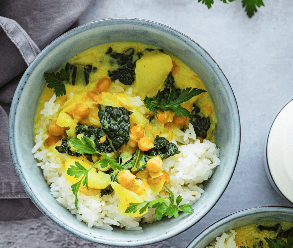 Faites chauffer l’huile dans une cocotte, puis ajoutez la pâte de curry, les feuilles de coriandre, mélangez. Ajoutez 25 cl d’eau, le lait de coco, le sucre et le tamari. Portez à ébullition, puis baissez le feu et ajoutez les pommes de terre, les pois chiches et le chou. Faites cuire 15 min.