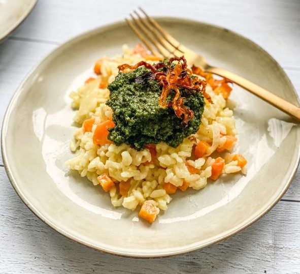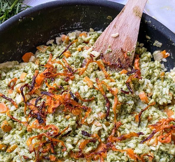 Risotto zéro déchet aux carottes et pesto de fanes